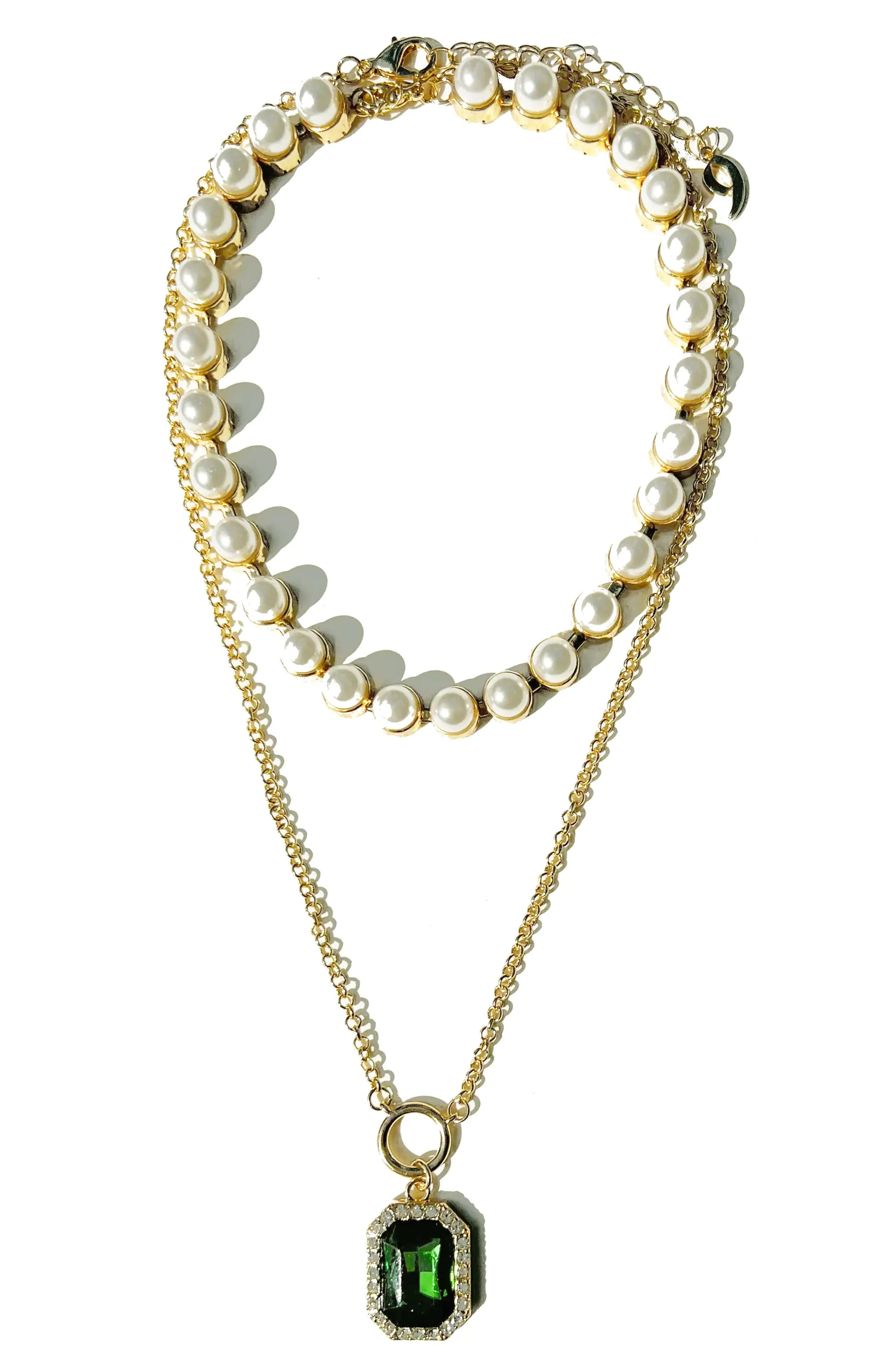 Crystal Emerald Pendant Necklace Set with Pearl Choker - 2 Pieces